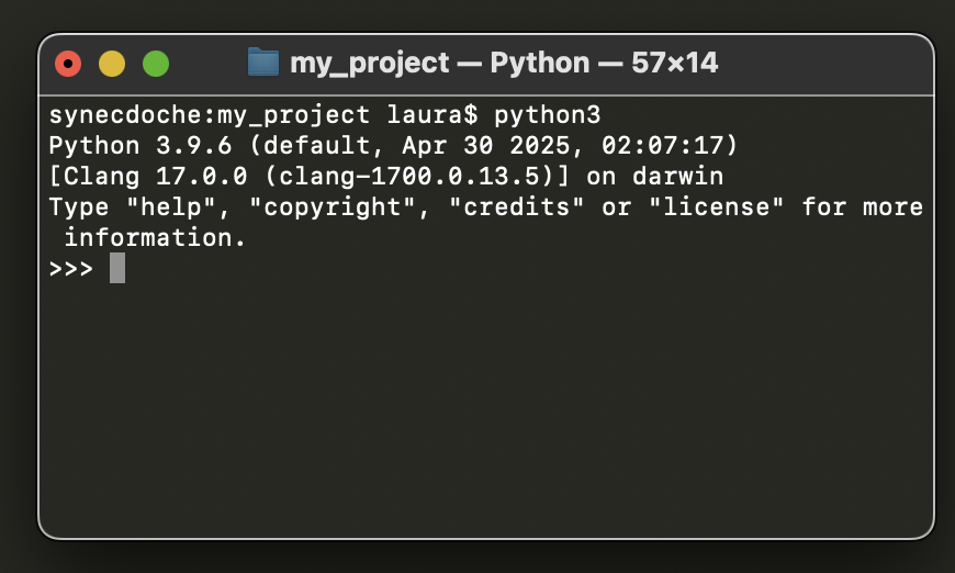 -- or - (double or single dash)-h, --help or man <command>Ctrl+C or Ctrl+ZTab key to autocomplete commands and file namesUp and Down keys to cycle through command historyq (typically) to quit multi-page outputspython is a program that can be run from the terminalREPL (Read-Eval-Print Loop), “interactive Python”, “Python console”Jupyter notebooks (.ipynb)Scripts (.py)Demo time! 🧑🏻💻👩🏻💻
