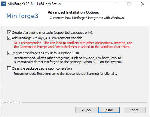 Add Miniforge to PATH when prompted during installation.