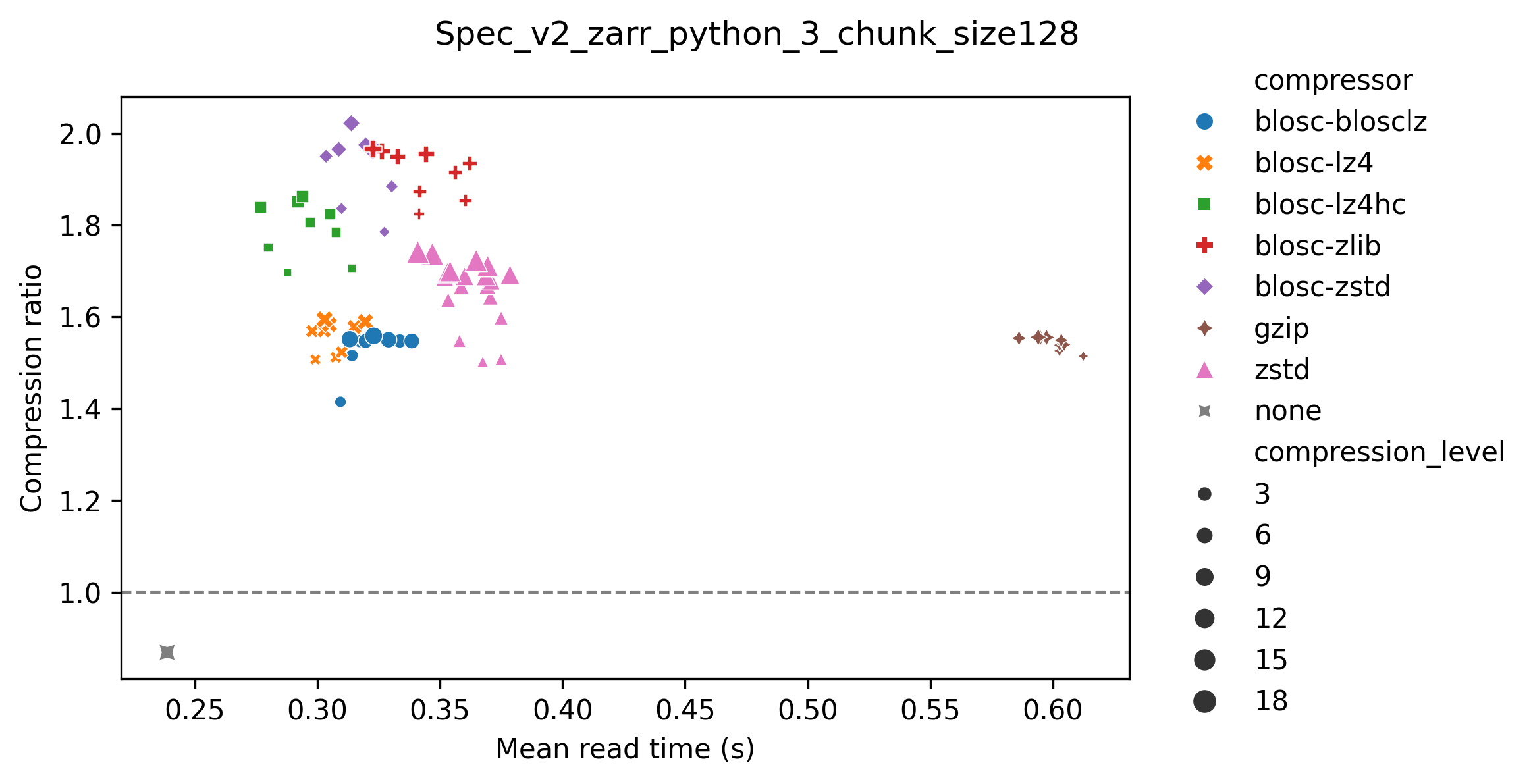 Choice of compression library affects read time more than compression level.