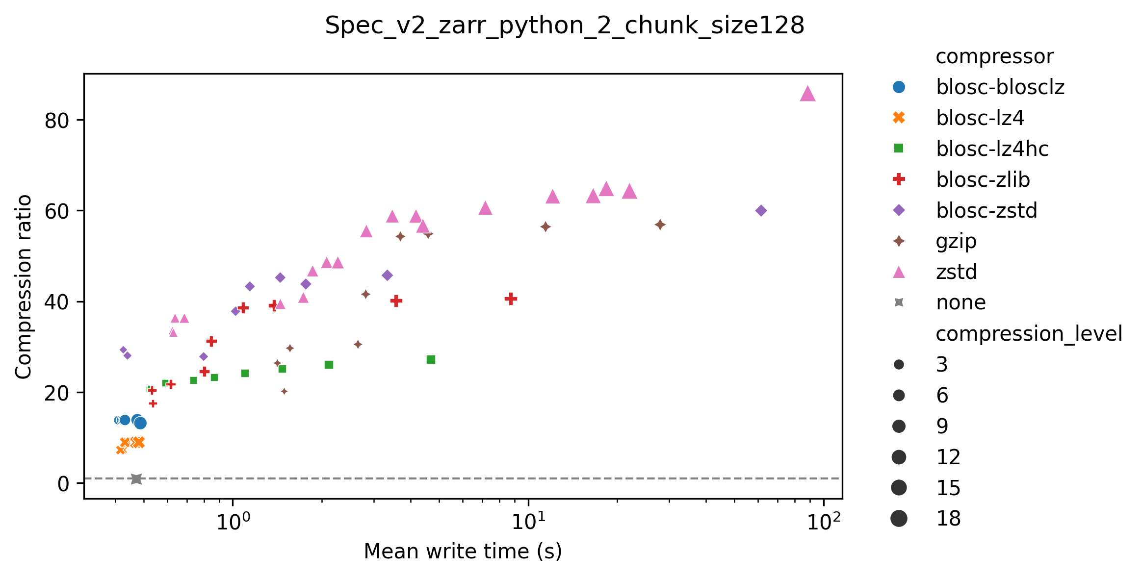 Choice of compression library affects write time + higher compression levels take longer to write.